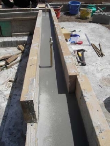 コンクリの基礎の一番上は木材が乗る訳ですからきちんと水平が出ていないと困ります。コンクリの基礎はバラスがゴロゴロ、凸凹になっています。そこで一番上の部分には厚さ数センチ程度のとろとろのモルタル(レベラー)を流して、あらかじめ測定していた水平面にあわせ、天端を形成します。